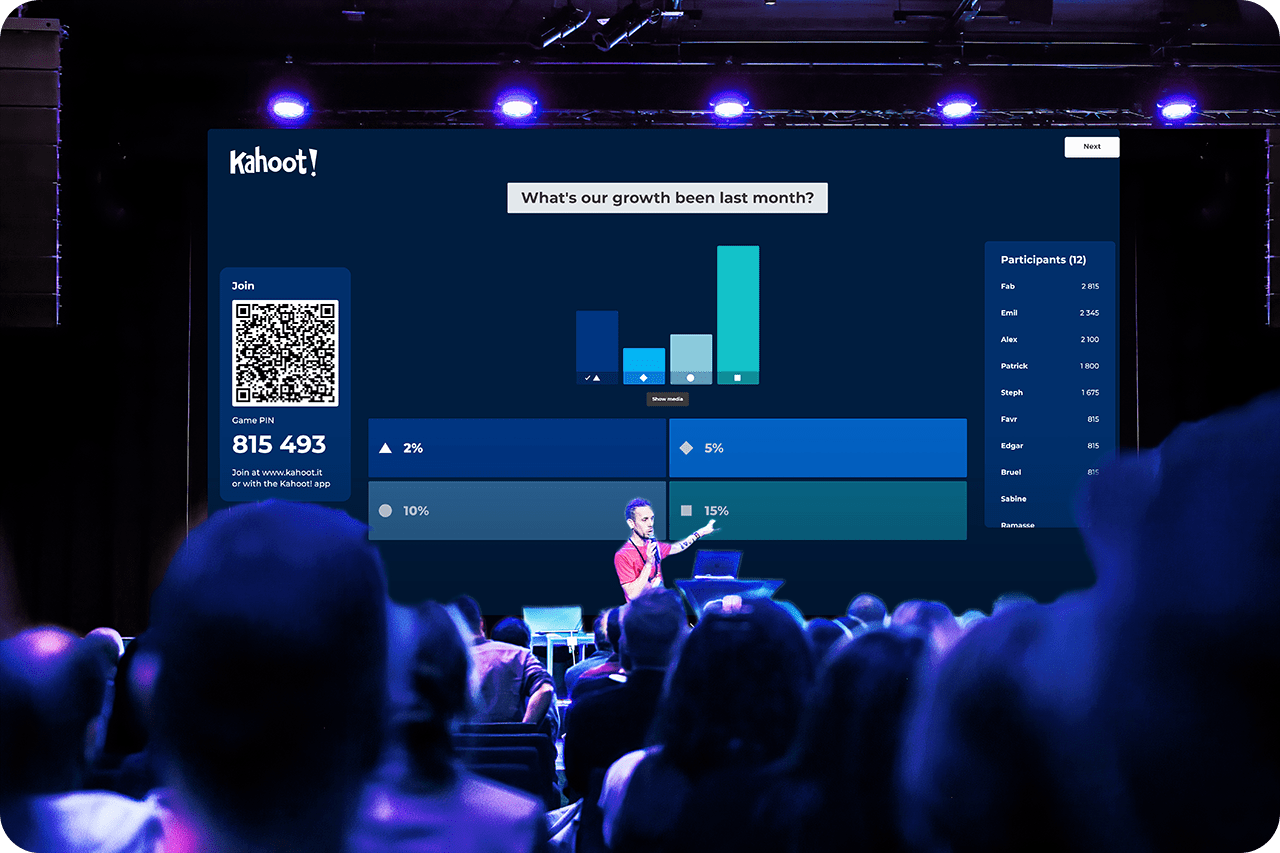 Instead, create a live digital outlet. One of the most effective interactive event ideas is a live QR Wall. Attendees scan a code and post comments, emojis, or be part of interactive surveys, games and observations that appear live on the big screen. It feels less like a lecture and more like a live stream. Something like Kahoot but more freeform.